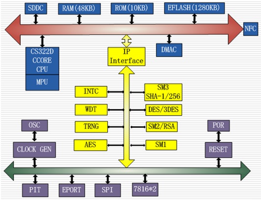 在一個(gè)傳統(tǒng)的SD存儲(chǔ)卡里,SD控制芯片只能連接閃存。在國(guó)芯“C*Core”安全SD/TF卡里,全新設(shè)計(jì)的SD安全控制器芯片在內(nèi)置安全模塊的同時(shí)還可以連接閃存模塊,并且可以實(shí)現(xiàn)同步的讀寫訪問(wèn)。客戶可以一邊使用閃存空間一邊進(jìn)行身份認(rèn)證和加解密操作。這種SD安全控制器芯片即為國(guó)密型號(hào)為SSX1208的32位信息安全芯片,該芯片的內(nèi)部結(jié)構(gòu)如圖1所示。